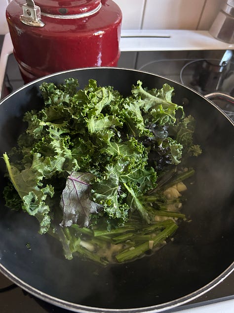Adler taught me to “meal prep”, not in the fitness YouTuber sense of the word, as in: preparing five chia seed puddings and chicken breasts with brown rice and broccoli for the week. I do, however, like to set myself up for success and soothe my anxious brain. In order to do that, I often make a medley of things on the weekend. I will always cook down a bunch of greens with olive oil, garlic, and lemon juice, as well as poach two chicken thighs and two wings in salted water. Once poached, I remove the meat and toss the bones, wobbly bits, cartilage, and skin back into the pot to make a stock. I drink the stock throughout the week (with a squeeze of lemon) and use it to cook rice or greens. Recently, I braised two heads of fennel with a ladle of chicken broth, added a splash of vinegar and fresh parsley & dill at the end, and ate it with a slice of toasted sourdough, which I rubbed raw garlic onto. Fennel lusciously melts into the braising liquid, and at the end, you’re left with a very rich-tasting pile of thoroughly cooked vegetables, my absolute favorite. I’ll make a batch of rice, which is supplemented with cubed carrots, mushrooms (shiitake are my favorite because a little goes a long way), and seaweed flakes. I’ll eat the rice with some of the chicken meat, the rest I save for rice bowls during the week, or make a quick chicken salad to put on top of pumpernickel bread (I’m having a deep pumpernickel renaissance, it feels very 90s). Sometimes I’ll use the rice to make a rice bowl with a sardine salad (tinned sardines mixed with yoghurt or skyr, dill, mustard, salt, and lemon juice), but often I’ll reheat it for breakfast, topped with a pat of butter, jammy boiled eggs, and soy sauce. The combination of soy sauce, butter, and hot rice is heavenly.